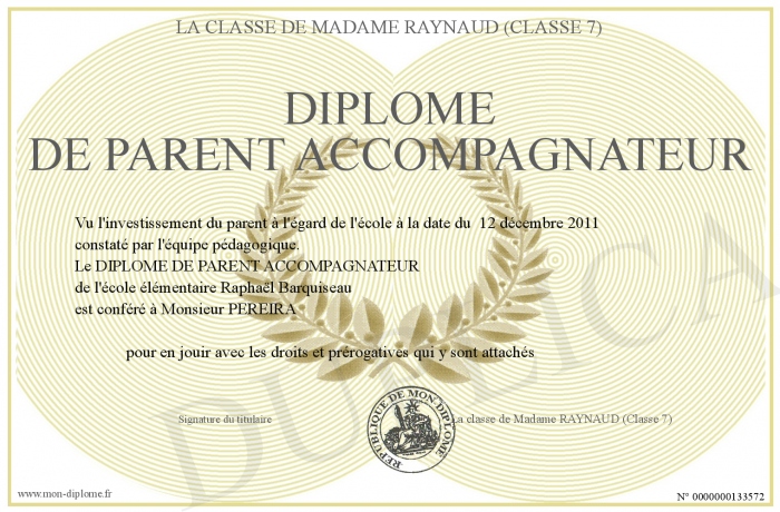 Envoyez par email votre DIPLOME DE PARENT ACCOMPAGNATEUR personalisé