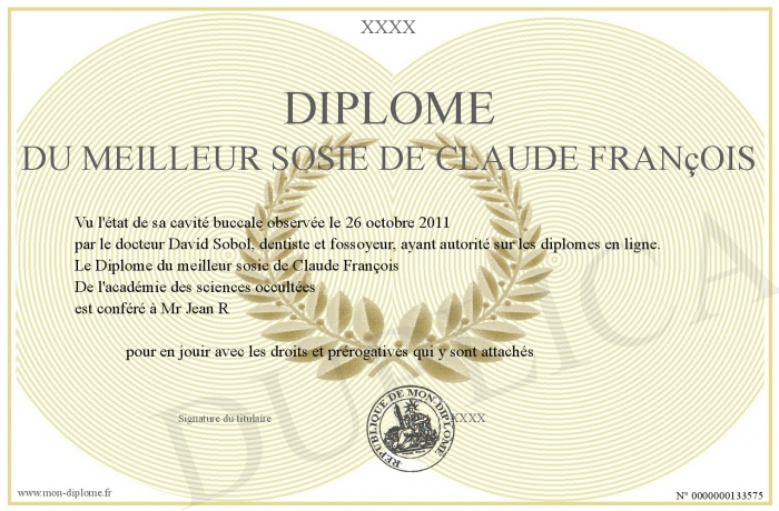 Envoyez par email votre Diplôme du meilleur sosie de Claude François personalisé