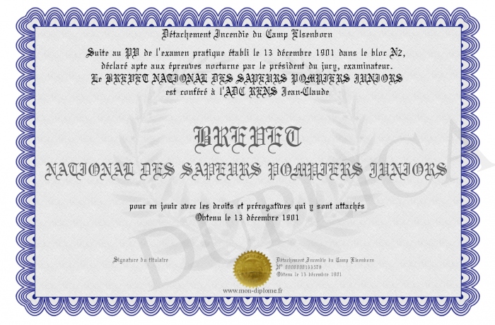 Envoyez par email votre BREVET NATIONAL DES SAPEURS POMPIERS JUNIORS personalisé