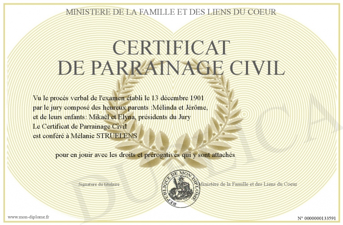 Envoyez par email votre Certificat de Parrainage Civil personalisé