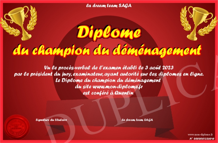 Envoyez par email votre Diplôme du champion du déménagement personalisé