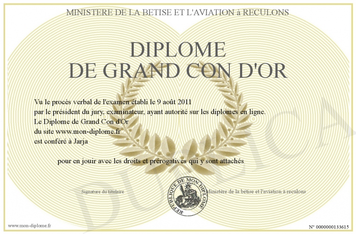 Envoyez par email votre Diplome de Grand Con d'Or personalisé