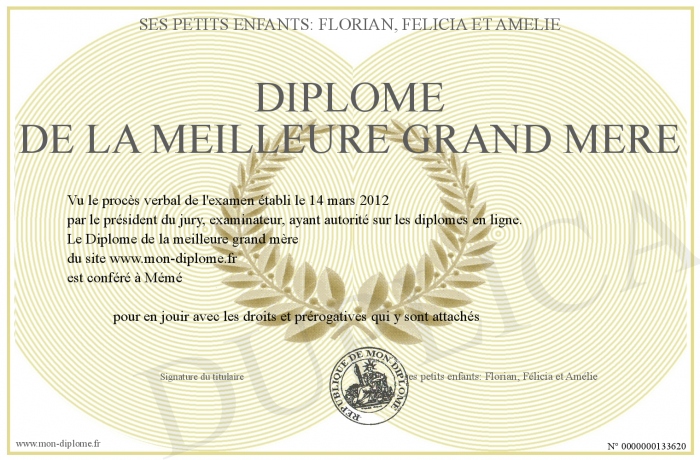 Envoyez par email votre Diplôme de la meilleure grand mère personalisé