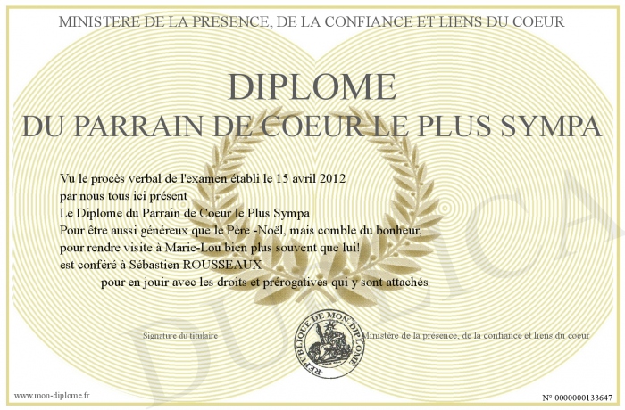 Envoyez par email votre Diplôme du Parrain de Coeur le Plus Sympa personalisé