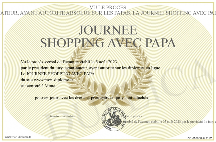 envoyé par le Vu le procès-verbal de l'examen établi le 05 août 2023 par le président du jury, examinateur, ayant autorité absolue sur les papas. La Journée Shopping avec Papa d'une valeur de 100 euros est conférée à Mona pour célébrer ses 12 ans !