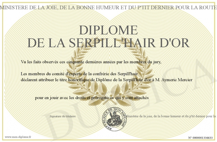 Envoyez par email votre Diplôme de la Serpill'hair d'or personalisé