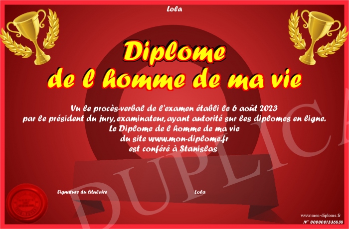 Envoyez par email votre Diplôme de l homme de ma vie personalisé