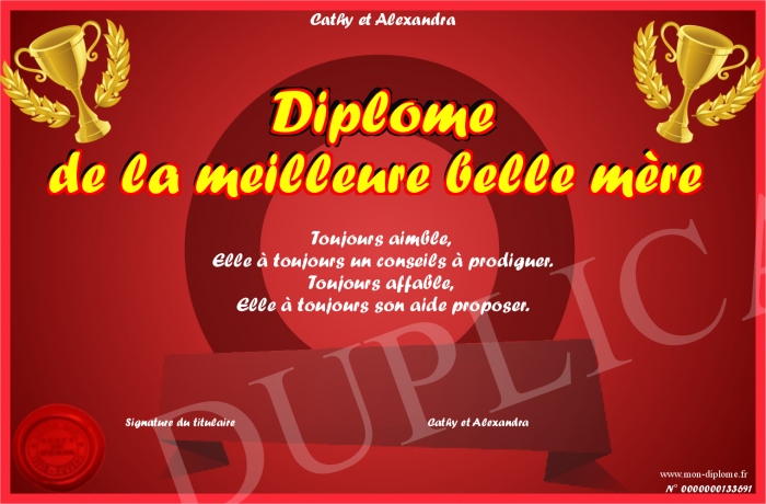 Envoyez par email votre Diplôme de la meilleure belle mère personalisé
