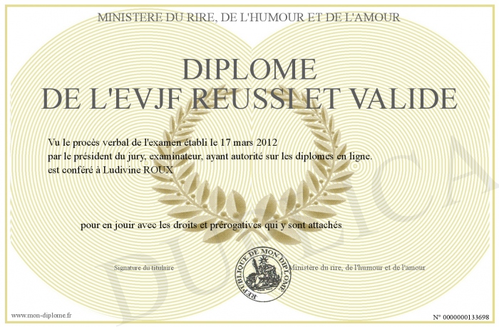 Envoyez par email votre Diplôme de l'EVJF réussi et validé personalisé