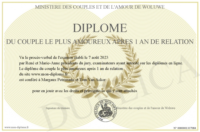 Envoyez par email votre Diplôme du couple le plus amoureux après 1 an de relation personalisé