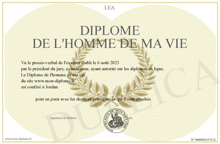 Envoyez par email votre Diplôme de l'homme de ma vie personalisé