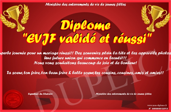 Envoyez par email votre Diplôme -EVJF validé et réussi- personalisé