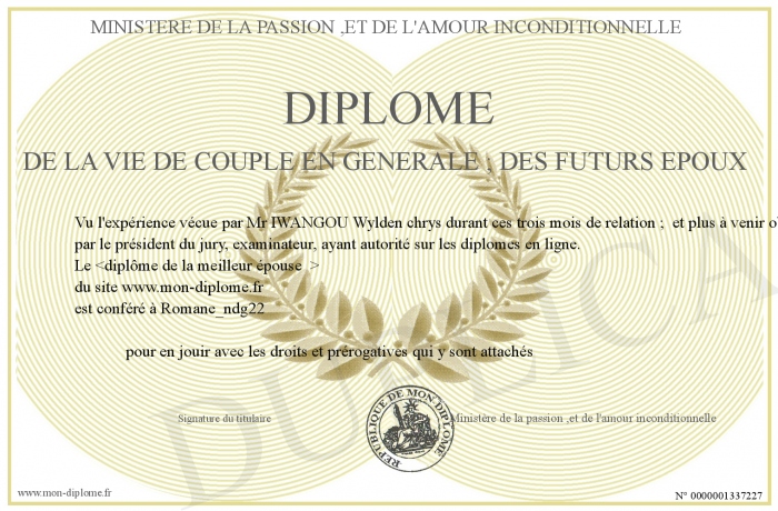 Envoyez par email votre Diplôme de la vie de couple en générale ; des futurs époux personalisé