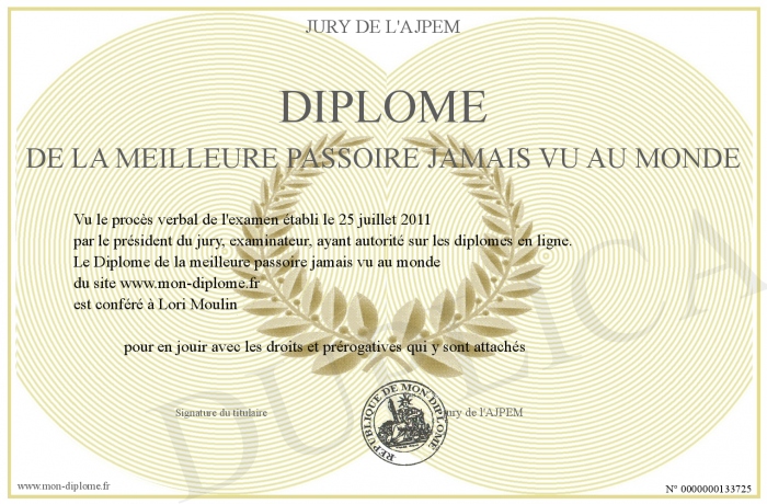 Envoyez par email votre Diplôme de la meilleure passoire jamais vu au monde personalisé