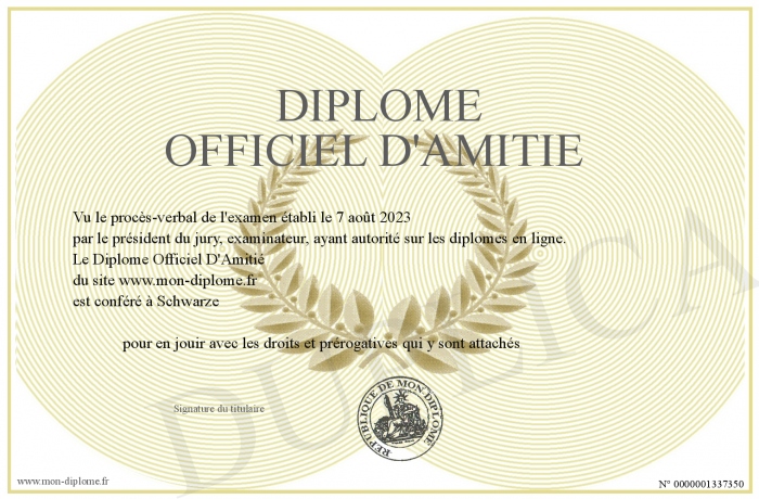 Envoyez par email votre Diplôme Officiel D'Amitié personalisé