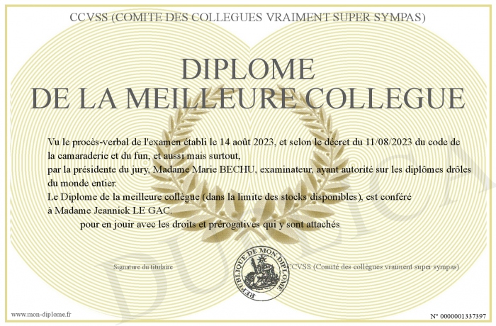 Envoyez par email votre Diplôme de la meilleure collègue personalisé