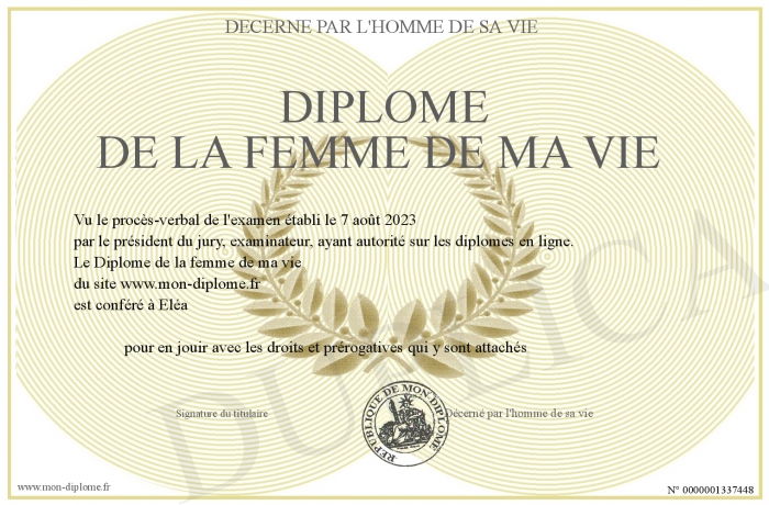 Envoyez par email votre Diplôme de la femme de ma vie personalisé