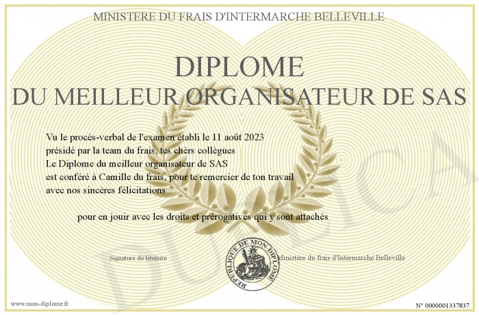 Envoyez par email votre Diplôme du meilleur organisateur de SAS personalisé