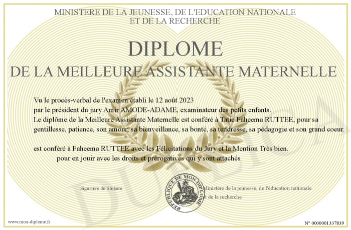 • Diplôme de la meilleure assistante maternelle