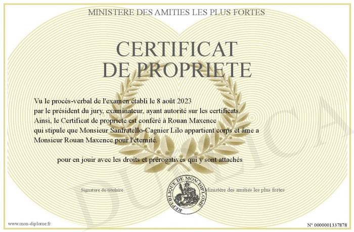 Envoyez par email votre Certificat de propriete personalisé