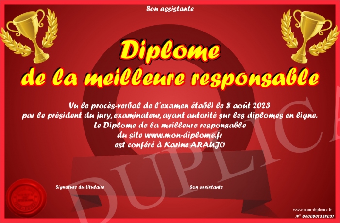 Envoyez par email votre Diplôme de la meilleure responsable personalisé