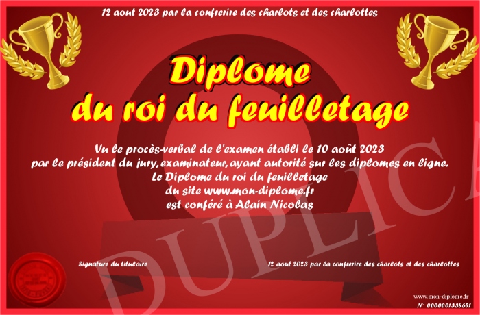 Envoyez par email votre Diplome du roi du feuilletage personalisé