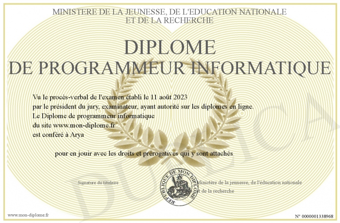 Envoyez par email votre Diplôme de programmeur informatique personalisé