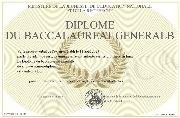 Envoyez par email votre Diplôme du baccalaureat généralb personalisé