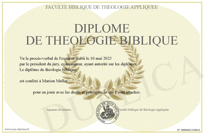 Envoyez par email votre Diplôme de théologie biblique personalisé
