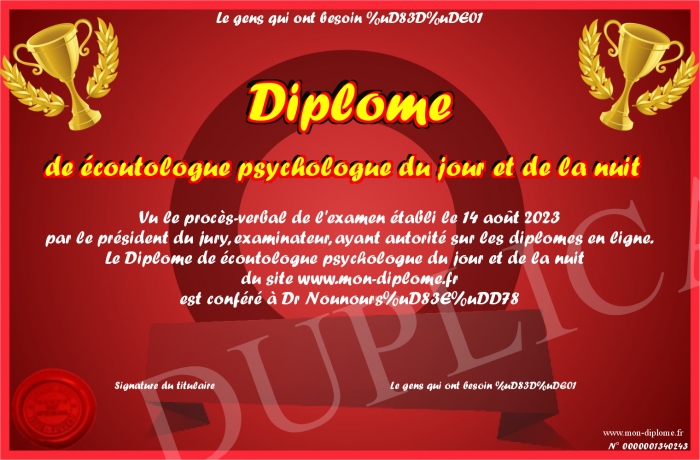 Envoyez par email votre Diplôme de écoutologue psychologue du jour et de la nuit personalisé