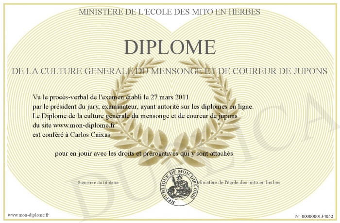 Envoyez par email votre Diplôme de la culture générale du mensonge et de coureur de jupons personalisé