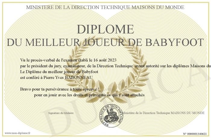 Envoyez par email votre Diplôme du meilleur joueur de Babyfoot personalisé
