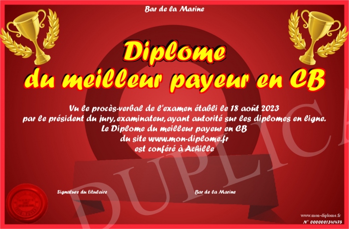 Envoyez par email votre Diplôme du meilleur payeur en CB personalisé