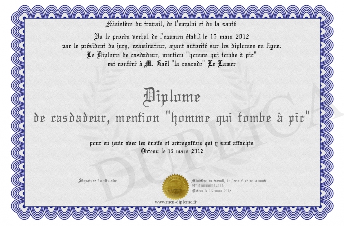 Envoyez par email votre Diplome de casdadeur, mention -homme qui tombe à pic- personalisé