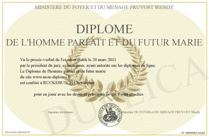 Envoyez par email votre Diplôme de l'homme parfait et du futur marié personalisé