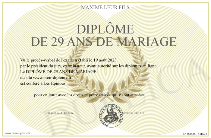 Envoyez par email votre DIPLÔME DE 29 ANS DE MARIAGE personalisé