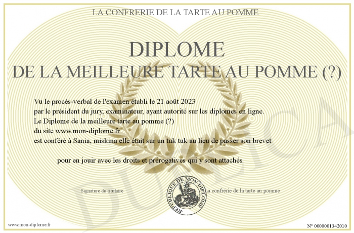 Envoyez par email votre Diplôme de la meilleure tarte au pomme (?) personalisé
