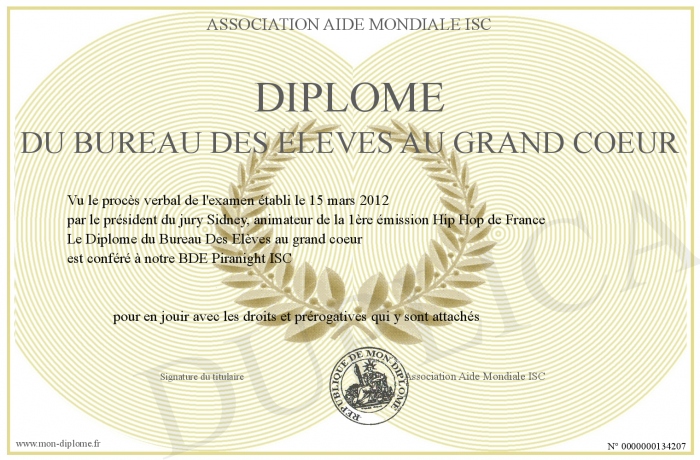 Envoyez par email votre Diplome du Bureau Des Elèves au grand coeur personalisé