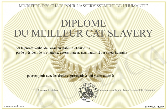Envoyez par email votre Diplôme du meilleur Cat Slavery personalisé