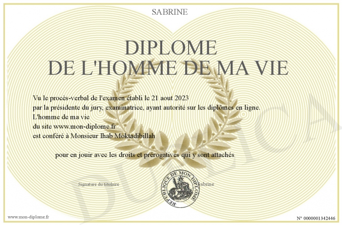 Envoyez par email votre Diplôme de l'homme de ma vie personalisé
