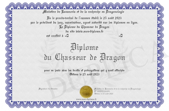 Envoyez par email votre Diplôme du Chasseur de Dragon personalisé