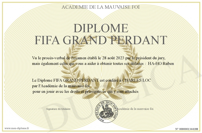 Envoyez par email votre Diplôme FIFA GRAND PERDANT personalisé