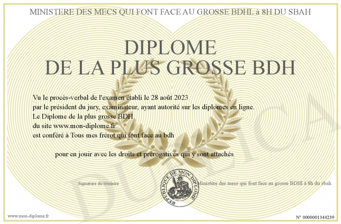 Envoyez par email votre Diplôme de la plus grosse BDH personalisé