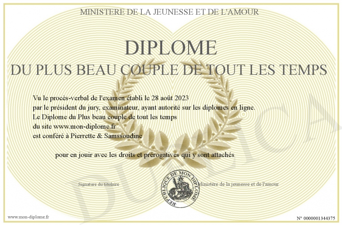 Envoyez par email votre Diplôme du Plus beau couple de tout les temps personalisé