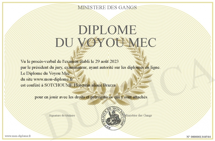 Envoyez par email votre Diplôme du Voyou Mec personalisé