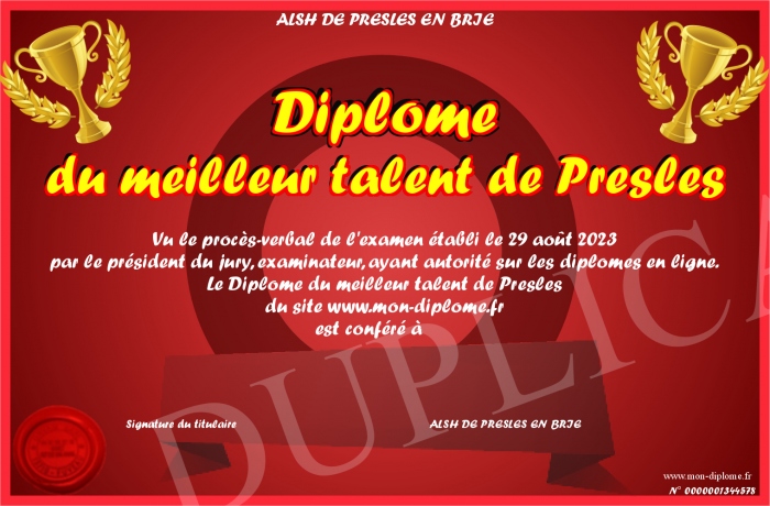 Envoyez par email votre Diplôme du meilleur talent de Presles personalisé