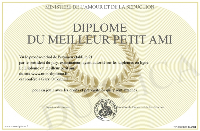 Envoyez par email votre Diplôme du meilleur petit ami personalisé