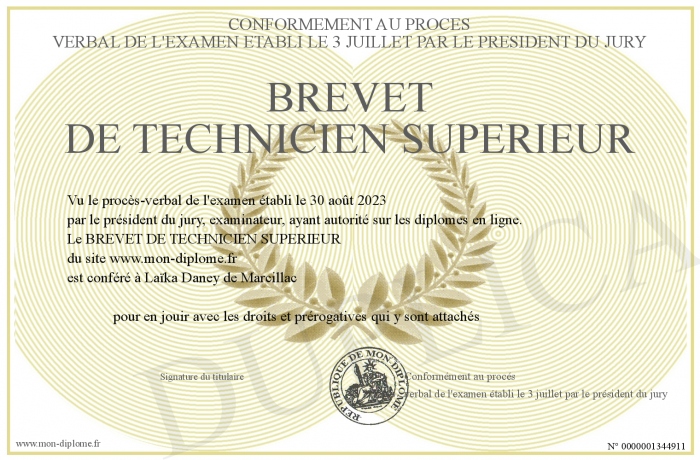 Envoyez par email votre BREVET DE TECHNICIEN SUPERIEUR personalisé