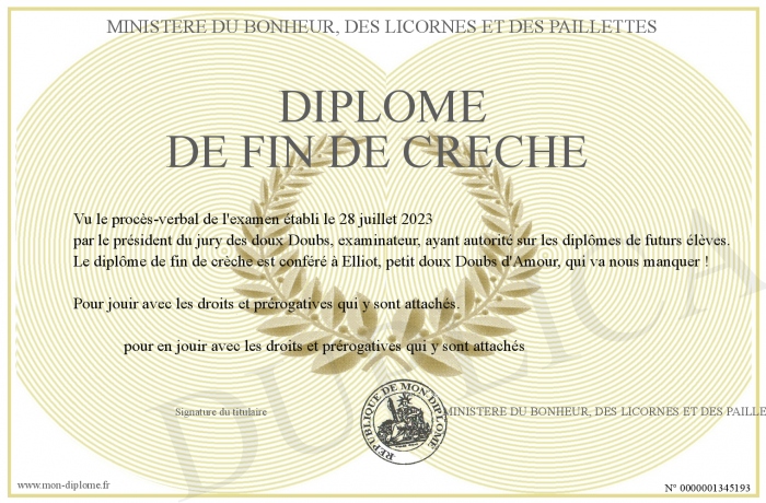 Envoyez par email votre Diplôme de fin de crèche personalisé