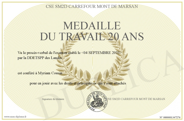 Envoyez par email votre médaille du travail 20 ans personalisé